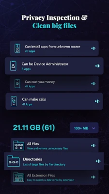 „Anti Scan: Spy & Virus Cleaner App" ne tik apsaugo, bet ir optimizuoja jūsų įrenginio veikimą bei valdymą. Atsikratykite nereikalingų failų, tokių kaip talpyklos, dideli ir pasikartojantys elementai, ar net „WhatsApp" medijos, su mūsų išmaniuoju šiukšlių valikliu ir atlaisvinkite brangią atminties vietą. Stebėkite savo programėlių naudojimo įpročius, kad geriau suprastumėte ir kontroliuotumėte savo ekrano laiką, skatindami sąmoningesnį išmaniojo telefono naudojimą. Taip pat, programa pateikia detalią įrenginio būsenos apžvalgą ir intuityvų programėlių tvarkyklę, leidžiančią efektyviai valdyti resursus ir matyti visą svarbią informaciją vienoje vietoje.