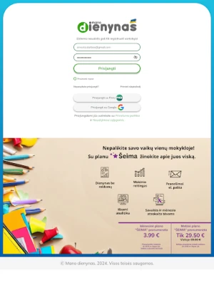 Norintiems dar daugiau privalumų ir visapusiškos informacijos, pristatome Mano dienynas šeima paslaugą. Ji ne tik pašalins bet kokias reklamas iš jūsų ekrano, bet ir suteiks galimybę giliau analizuoti mokinio reitingus bei individualią pažangą, leidžiančią geriau suprasti stipriąsias puses ir tobulintinas sritis. Supraskite savo vaiko mokymosi kelią iki smulkiausių detalių! Taip pat gausite svarbius pranešimus tiesiai į savo el. paštą ir kiekvieną savaitę – išsamią ataskaitą, apibendrinančią visą mokymosi veiklą. Tai puikus įrankis tėvams, norintiems aktyviai ir informuotai dalyvauti savo vaikų edukacijoje.
