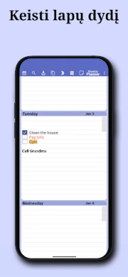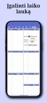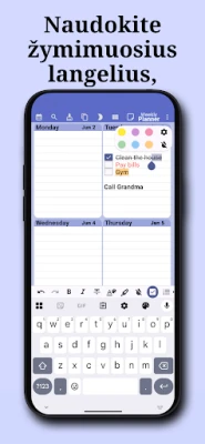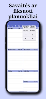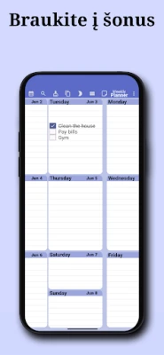 „Savaitės planavimo priemonė" išsiskiria savo intuityviu dizainu, leidžiančiu akimirksniu pamatyti esamos savaitės perspektyvą. Vos atvėrę, matysite savo dienos ir savaitės planus, pasiruošusius papildyti naujais įvykiais ar pažymėti jau įvykdytas užduotis. Suplanuokite visus metus, mėnesius ar savaites į priekį, kurkite kasdienes, savaitines, mėnesines ar metines pasikartojančias užduotis ir lengvai ieškokite reikalingų įrašų. Asmenizuokite savo patirtį, keisdami programėlės spalvų schemą, puslapio dizainą ir net šrifto dydį bei spalvą, kad ji atspindėtų jūsų unikalų stilių.